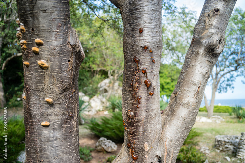 © sorin, Obraz premium Two tree trunks with their bark covered in mushrooms and respectively resin against a seaside backdrop.