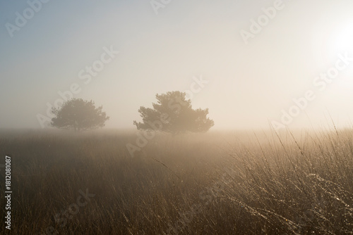 © Rob, Fototapeta premium Two trees are standing in a field of dry grass. The sky is foggy and the sun is shining lightly in the Netherlands.