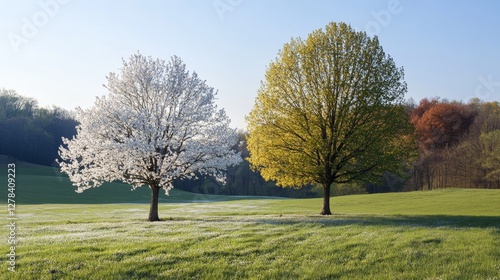 © Valeriia, Obraz premium Two Trees in Springtime Meadow: A Peaceful Spring Scene