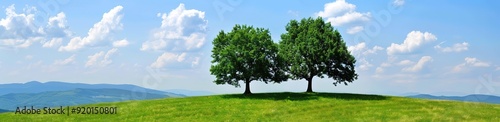 Fototapeta premium Two trees stand on a grassy hill against a blue sky with white clouds. A...