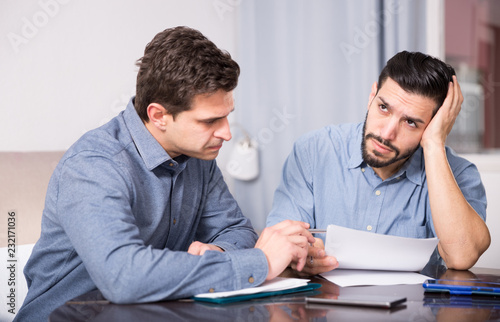 Obraz premium Two troubled men reading documents at desk