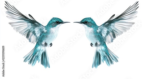 Naklejka premium Two turquoise hummingbirds facing, wings spread, isolated white background, perfect for design