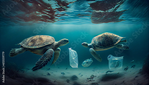 Obraz premium Two turtles and plastic bags underwater, zero waste and World ocean pollution...