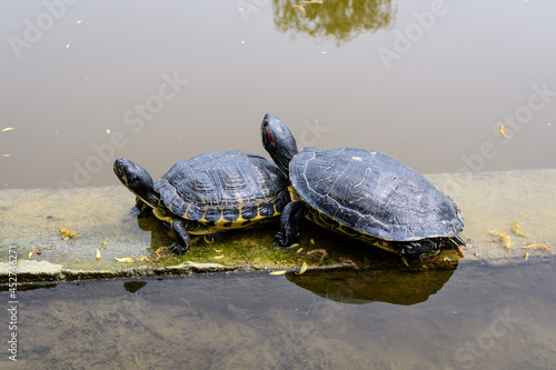 Fototapeta premium Two turtles laying in the sun heat near a lake in a sunny spring day,...