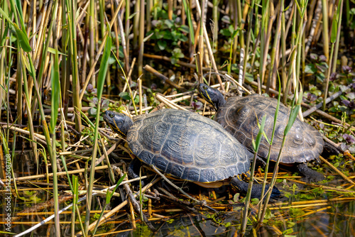 Fototapeta premium Two turtles on the shore, The red-eared slider or red-eared terrapin is a subspecies of the pond slider, A semiaquatic turtle belonging to the family Emydidae, Water tortoise in its habitat in canal.
