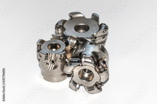 Naklejka premium Two undamaged and one damaged indexable milling cutter for CNC milling machine with selective focus isolated on white