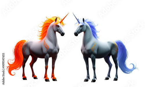 © DesignDividends, Obraz premium Two Unicorns, Isolated Transparent Background, Neon Orange and Blue Design Elements