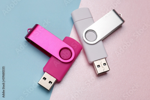 © Pixel-Shot, Fototapeta premium Two USB flash drives on color background