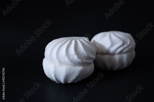 © солоны цыбикова, Obraz premium Two vanilla marshmallows on a black background close-up.