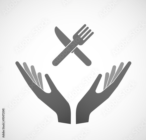 Obraz premium Two vector hands offering a knife and a fork