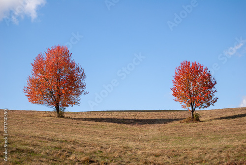 Obraz premium Two Vibrant Autumn Trees on a Hillside
