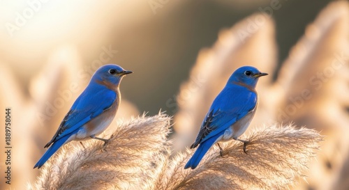 © MST, Fototapeta premium Two vibrant bluebirds perched on cattails in warm sunlight