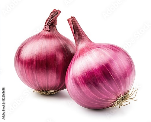 Fototapeta premium Two vibrant, deep red onions, close-up, isolated on white. Fresh, whole, and ready to use in culinary creations. Their firm, glossy skin hints at their quality and potential