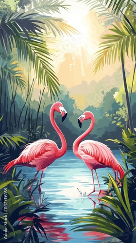 © Mia , Fototapeta premium Two vibrant flamingos gracefully standing by a serene water body surrounded by lush foliage at sunrise
