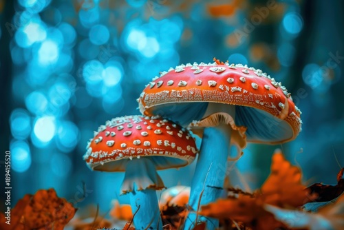 © nsit0108, Fototapeta premium Two vibrant fly agaric mushrooms thrive in a magical, bokeh lit forest