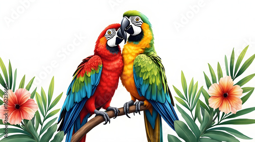 © klimoha237, Obraz premium Two vibrant Harlequin Macaws perched on a branch amidst lush tropical leaves and colorful flowers. A watercolor illustration featuring exotic flora, perfect for design, prints, or backgrounds.