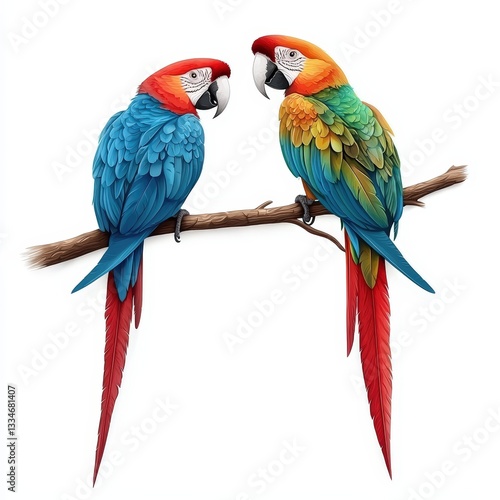 © charoensuk, Obraz premium Two vibrant macaws perched on a branch, showcasing their stunning colorful feathers in a natural setting.