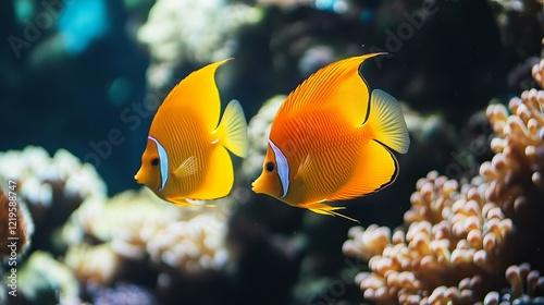 © Harry, Fototapeta premium Two Vibrant Orange Butterflyfish Swimming Underwater Tropical Reef Colorful Aquatic Life Ocean Scene Vivid Marine Wildlife Nature Photography sea art coral