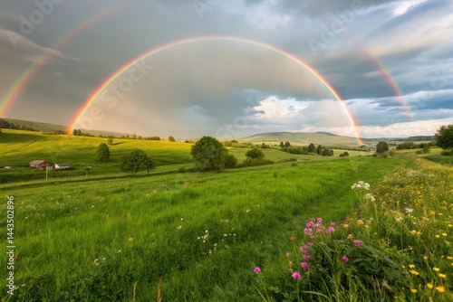 © Роман Заворотный, Naklejka premium Two Vibrant Rainbows Over a Lush Green Field in Springtime Generative AI