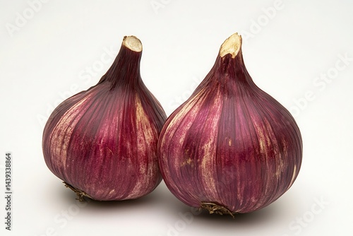 Obraz premium Two vibrant red onions positioned closely against a clean white background,...