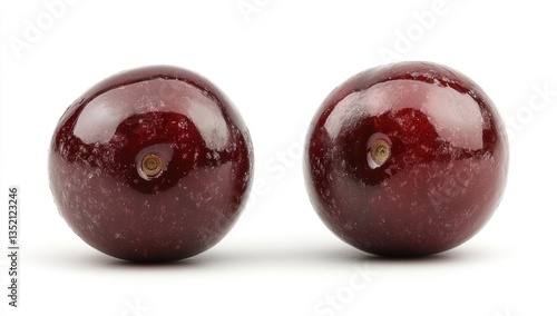 © SYAHRUL, Obraz premium Two vibrant, round plums, isolated on white. Close-up view highlighting their deep red color and glossy texture