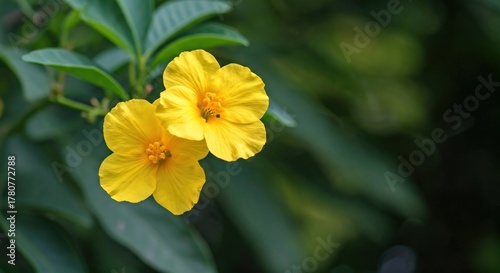 Fototapeta premium Two vibrant yellow flowers in full bloom with lush green foliage, bokeh...