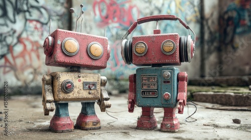 Fototapeta premium Two vintage toy robots stand outdoors one wears headphones both are weathered against a graffiti backdrop
