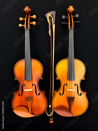 © Danielle, Naklejka premium Two violins bow and rope on black background musical instruments stringed instruments wood brown beige