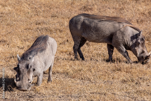 © Jill Clardy, Fototapeta premium Two Warthogs Grazing on Golden Grasses, Ol Pejeta Conservancy, Kenya, Africa