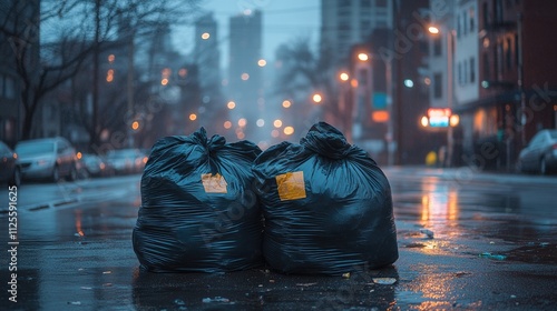 Obraz premium Two waste bags sitting next to a road, perfect for depicting litter or urban...