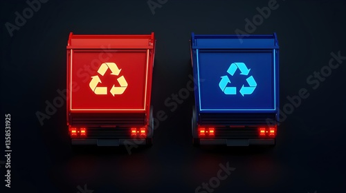 © Teerapat, Obraz premium Two Waste Trucks with Bright Recycling Symbols in Red and Blue