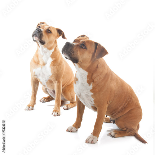 Obraz premium two watchful stafforshire mother and daugher isolated