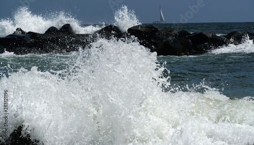 © Thomas, Obraz premium Two waves can be seen in the foreground and background while a sail boat goes by.