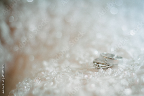 © FAMILY STOCK, Fototapeta premium Two wedding rings on a textured background