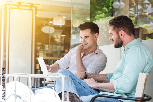 © stnazkul, Fototapeta premium Two Westerner Business men working with laptop and smartphone to