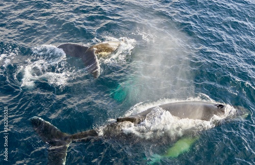 © HWL Photos, Naklejka premium Two whales surfacing and showing back in blue antarctic ocean, Antarctica