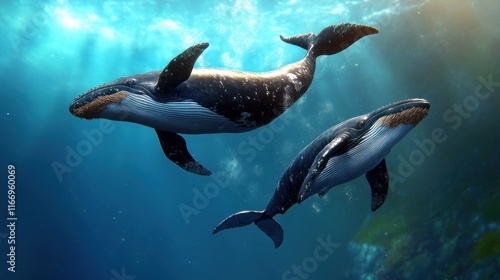 © julio, Fototapeta premium Two whales swimming gracefully in a sunlit underwater scene.