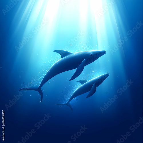 Fototapeta premium Two Whales Swimming in Deep Blue Ocean Sunlight