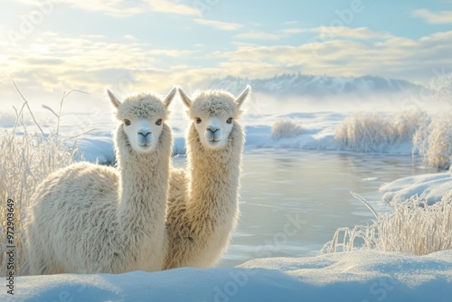 © Nico, Fototapeta premium Two White Alpaca Standing in a Snowy Landscape