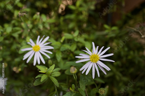 © Ashton Fei, Obraz premium Two white Asteraceae flowers with green leaves in the background