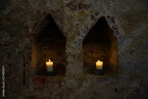 Fototapeta premium two white burning candles in two niches in a dark old brick wall of a...
