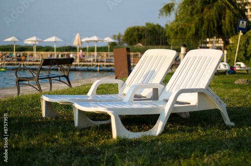© dima4to, Fototapeta premium Two white chairs at the beach in the summer. Travel concept
