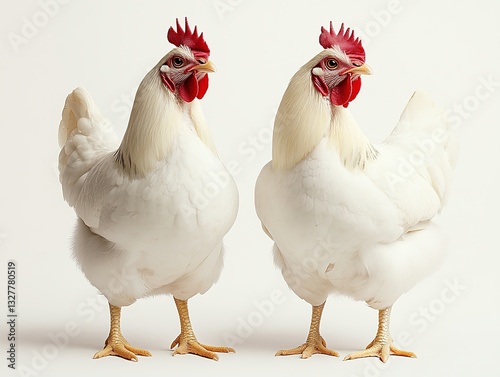 © Roxana, Fototapeta premium Two white chickens isolated on white. Pair of poultry birds standing together. White farm chickens on plain background