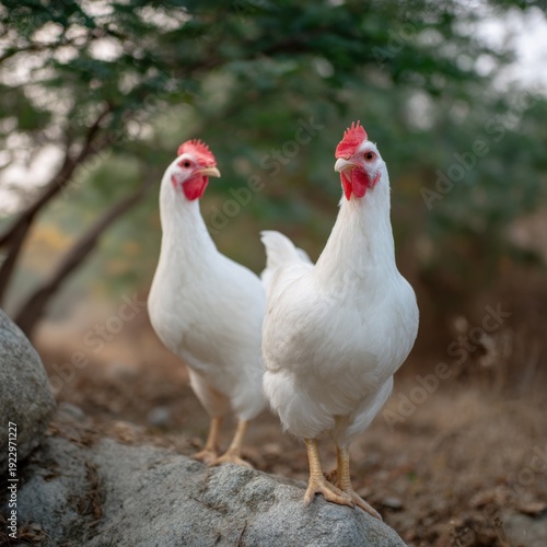 Fototapeta premium Two white chickens standing on rocks in a natural outdoor setting