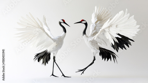 © SlashStd, Obraz premium Two white cranes with wings spread, facing each other.