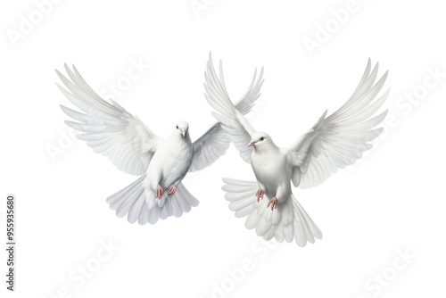Fototapeta premium Two white doves are in flight, symbolizing peace and freedom. Great for logos, backgrounds, or designs promoting peace and unity