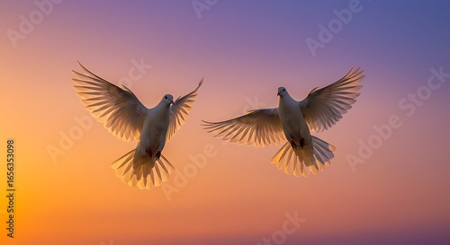 © Fio, Obraz premium Two white doves flying gracefully against a vibrant sunset sky