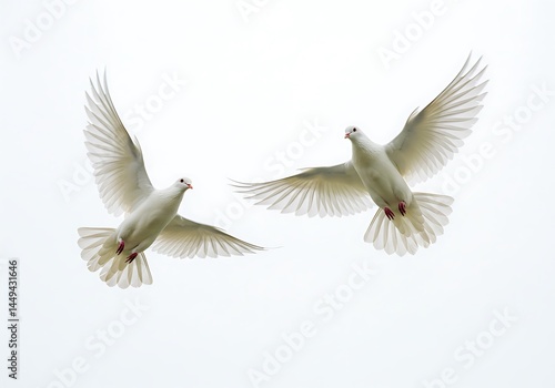 © Muaz, Obraz premium Two white doves gracefully soaring against a bright sky with wings spread wide in elegant flight