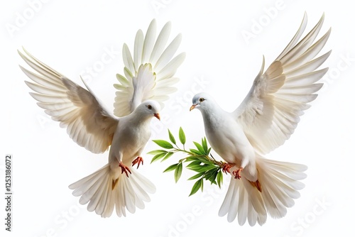 © Man888, Obraz premium Two White Doves in Flight with Olive Branch - Panoramic Peaceful Stock Photo