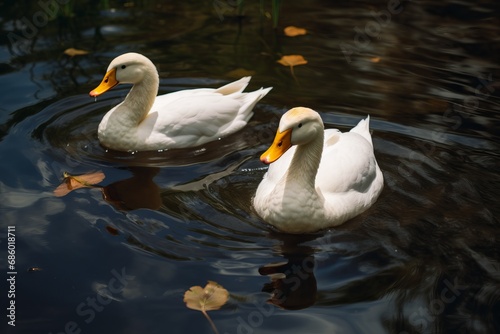 Fototapeta premium Two white ducks swimming in a pond